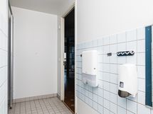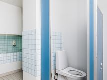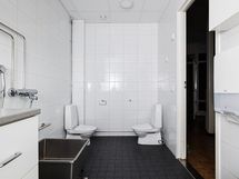 Kaksi matalalla olevaa pesuallasta, kaapisto, 2 wc-istuinta, lattia laatta, seinät
