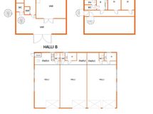 Tila on jaettavissa. Uudempi halli (B) on valmistunut v. 2005 ja se on jaettu kolmeen huoneistoon. Yhtiöjärjestyksen mukaiset pinta-alat: B1 88 m2, B2 100 m2 ja B3 112 m2. Jokaisessa huoneistossa on wc ja keittotilat, sekä parvi. Hallin vapaa korkeus on noin 4,5-5,0 m. Nosto-ovet 3,4 m x 4,5 m. Huoneistojen yhteenlaskettu pinta-ala 300 m2. DVV:n rakennustiedot lomakkeen mukaan rakennuksen kerrosala on 330 m2. Vanhempi hallirakennus (A) on valmistunut v. 1986 ja siinä on yhtiöjärjestyksen mukaan kylmä varastotila A1 105 m2, lämmintä varasto- ja sos. tilaa 57 m2 (A2), sekä 2. kerroksessa toimisto- ja sosiaalitilaa 81 m2 (A3). Tämä huoneisto kattaa 2h, keittiö, sauna, psh. Kulku huoneistoon on sekä ulko-, että sisäportaan kautta. Huoneistojen yhteenlaskettu pinta-ala 243 m2. DVV:n rakennuksen tiedot lomakkeen mukainen pinta-ala on 286 m2. Rakennus C on varastokatos, yhtiöjärjestyksen mukainen pinta-ala 105 m2, DVV:n rakennuksen tiedot lomakkeen mukainen kerrosala on 111 m2.