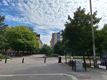 Rauhallinen katuosuus Eerikinkadun päässä, upea puistonäkymä vastapäätä.