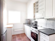 - asunnon keittiö: puolet kaapistosta, välitila, hana/sekoitin, hella, käytetty jääkaappi