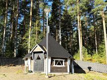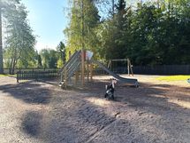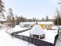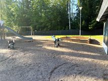 Tontilla aidatut leikkialueet leikkivälineineen ja kalusteineen, sekä grillikota.