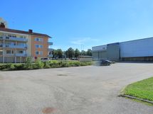 Tasainen ja asfaltoitu. Pysäköintitilaa molemmilla puolilla rakennusta.