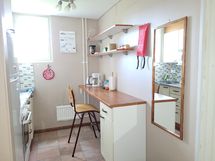 Keittiön varusteet: Jääkaappi ja liesi. Työtason materiaali: Puu.