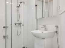 Suihku, Suihkuseinä, Pesukonevalmius, Peilikaappi, Allaskaappi, Lattialämmitys