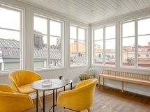 Asuinhuoneisto sijoittuu pääosin rakennuksen toiseen kerrokseen. Yläkerran tilat sijoittuvat korkean mansardikaton alla. Iso kuisti sisäpihalle. Kaikki pinnat ja rakenteet ovat uusittu. Asuinhuoneisto todella uniikki. Kolme makuuhuonetta, iso olohuone, keittiö ruokailutilalla, kaksi wc-kylpyhuonetta ja kaksi aulaa. Huoneisto sopii erinomaisesti kodiksi tai airbnb-käyttöön. Huoneiston pinta-ala on noin 184 neliötä.