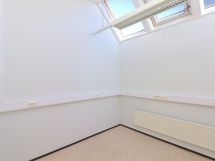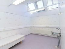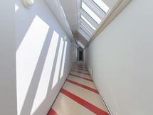 Kaikissa huoneissa on kattoikkunat. Sisäänkäynti ostokeskuksen takaa