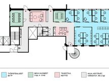 Toimisto soveltuu erinomaisesti niin monitilatoimistoksi noin 26 henkilölle kuin huonetoimistoksi noin 18 henkilölle. Henkilömäärät ovat suuntaa antavia arvioita ja riippuvat tilaratkaisusta.