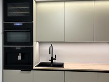 Tasokkaassa keittiössä mm. kaluste uuni, viinikaappi ja kahvinkeitin.