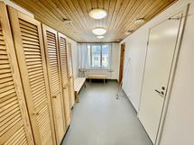 Tilat muodostuvat seuraavasti: - iso ja tilava terapia/harrastehuone, n. 30 m2 - ison tilan yhteydessä varastokomero n. 2 m2 - pieni terapia/taukohuone minikeittiöllä, n. 13 m2 - pukuhuone ja WC, n. 12 m2 Lisäksi yhteisenä tilana tilava eteisaula ja suihkut.