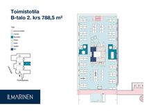 Tilan kuvaus: Nykyaikaisella tekniikalla varustetut valoisat ja viihtyisät toimistotilat ovat helposti muunneltavissa avo-, huonetoimistoiksi tai tehokkaiksi monitilaratkaisuiksi. Monitilassa on työpisteiden lisäksi on myös erilaisia tiimityöskentely- ja kokoustiloja. Oheinen pohjakuva antaa esimerkin tilakäytöstä tehokkaana avotilana. Tila sijaitsee talon B-siivessä.