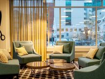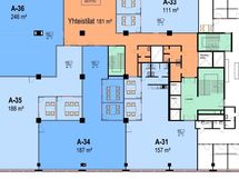 Kerroksen yhteisissä tiloissa löytyvät mm. keittiö, vessat ja kerrosta alempana lounasravintola ja vuokrattavat kokoustilat.