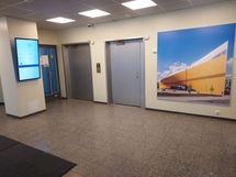 Yhteiset aula-, keittiö- ja wc-tilat. Tilat toisessa kerroksessa, käynti hissillä ja portaista.