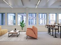 Avara päätytoimisto ikkunoilla kolmeen suuntaan. Tila on nykymuodossaan avotoimisto, jossa on neuvotteluhuone sekä työhuone. Lisäksi tilassa on oma taukokeittiö. Tila voidaan jakaa myös kahdelle käyttäjälle. Ilmoituksen kuvat ovat havainnekuvia rakennuksen tiloista eivätkä välttämättä vastaa juuri tätä tilaa.