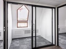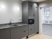 Vapautumassa valloittavan valoisa ja tunnelmallinen pikku toimisto Helsingin ydinkeskustasta. Ilmoituksen kuvat ovat kiinteistön eri tiloista.
