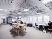 Ylimmän kerroksen toimisto, jossa on käytössä oma parveke. Tehokas toimisto avotilalla ja kahdella neuvotteluhuoneella.