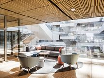 Talon kerroksien toimistot kiertävät suurta valoatriumia, jolloin neuvottelutiloja on mahdollisuus rakentaa atriumin laidalle ja ikkunaseinät jättää avotilaksi.