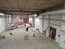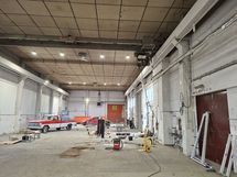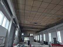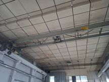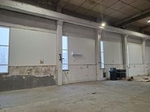Toimistot hallin perällä toisessa kerroksessa. Kaksi nosto-ovea, siltanosturi.