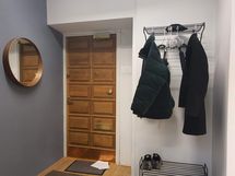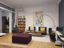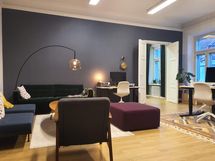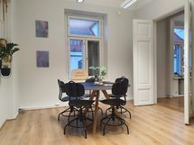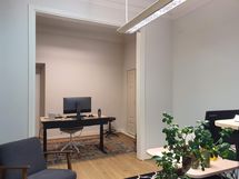 Kohteeseen kaksi sisääntuloa, joista toinen avautuu neuvottelutilaan ja toinen eteiseen. Lisäksi tilassa reilun kokoinen taukokeittiö, kaksi isoa työskentelytilaa ja WC-tilat.
