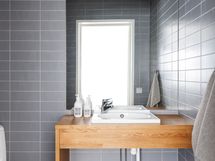 Pohjaratkaisu yhdistää avotilan ja lasiseinäelementein rajatut huoneet, mikä luo tilaan avaruutta ja modernia ilmettä. Lattiamateriaali on tummaa tekstiilimattoa, joka tuo tyyliä ja kontrastia tilan rouheaan tunnelmaan.