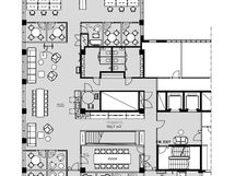 Viidennessä kerroksessa sijaitseva avotoimisto, jossa on lisäksi puhelinkoppeja, hiljaisia vetäytymistiloja sekä suurempi neuvotteluhuone.