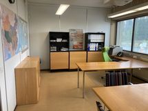 Työpöytä, työtuoli, tasoja, hyllyjä yms.