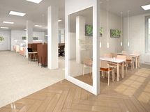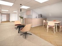Katutason moderni tila, jossa useampi pienempi huone ja iso neukkari.