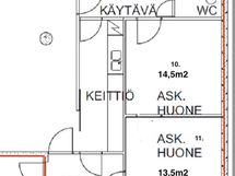 Vuokralaisella käytössä yhteis-keittiö, wc ja eteistilat. Pohjakuvassa huone nro 10.