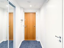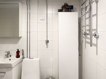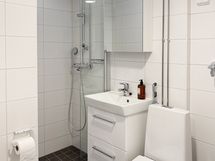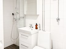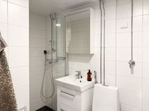 - Pesutilojen varusteet: WC-istuin, suihkuseinä, suihku, bidee-suihku, allaskaappi, pesuallas ja pesukoneliitäntä. Pesutilojen kuvaus: Kylpyhuone uusittu 2017 LVISA-remontin yhteydessä.