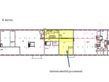 Teollisuus kiinteistön 4 kerroksessa on vapaana valmistuskeittiö, ruokasali ja cabinetti tila. Tila jakautuu valmistukeittiiö noin 80 m2, kylmiöt, pakastin ja sosiaalitilat noin 80 m2. Ruokasali 160 m2 ja Kabinetti 25 m2. Soveltuu erittäin hyvin Catering käytttöön tai erilliseksi pieneksi juhlatilaksi. Tilaan on pääsy sekä henkilöhissillä ja tavarahissillä lastauslaiturilta.