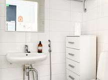 Pesutilojen varusteet: WC-istuin, pesuallas ja peilikaappi.