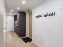 Vinyylilankku eteisessä ja aulatilassa, äänieristystä parantavat allergiaystävälliset matot toimistohuoneissa, äänieristävät seinäefektit, Puustellin uusi keittiö