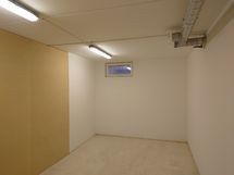 Tila hyvin muunneltavissa. Tällä hetkellä jaettu kevyellä väliseinällä kahteen osastoon. Auton saa aivan oven viereen. Lattialämmitys maalämmöllä ja koneelinen ilmanvaihto. Tilasta löytyy pistorasiat, myös voimavirta. Sähkön käyttö sisältyy vastikkeeseen, eli ei muita kuluja. Oviaukon sivuoven saa myös auki kulkua helpottamaan