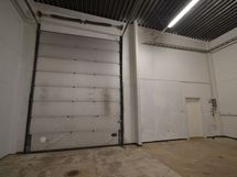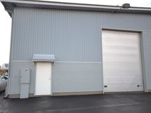 Iso, sähkökäyttöinen nosto-ovi, koko n. 3490 x 4730 ja normaali käyntiovi.