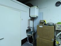 Hallissa takaosassa on erillinen vesipiste, lisäksi hallissa on lattiakaivo ja koneellinen ilmanvaihto. Kuvissa näkyvä musta varastohyllykkö kuuluu tilaan ja on vuokralaisen käytettävissä.