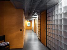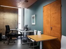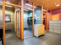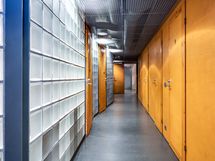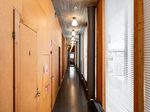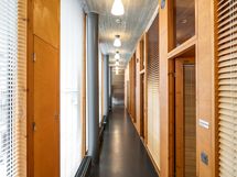 Huoneiden seinät ovat puukuitulevyä ja pääsoin betonipintaa. Kerroksia yhdistää korkea taukokahvila-aulatila.