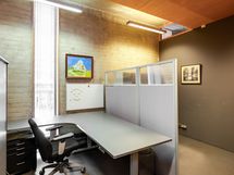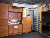 ** n. 83 m2 Pohjakerroksessa on keittiö/ taukotila, sekä toimisto/neukkaritilaa. Tila on keskiosaltaan taukotilan kohdalta kokonaan avoin ylös 2. kerrokseen asti.