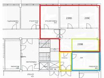 Mahdollisuus vuokrata 1-4 toimistohuonetta + yhteistila. Pohjakuvaan rajattu punaisella koko tila 89m2. Vihreällä merkitty 239B toimistohuone, jota ei ole rakennettu.