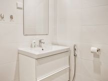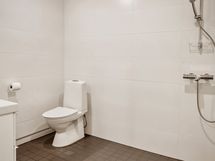 - Pesutilojen varusteet: WC-istuin, suihku, peili, pesuallas, allaskaappi ja bidee-suihku. Pesutilojen kuvaus: Laatoitettu isohko kylpyhuone.