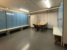 Kerrosten välistä löytyy tilavat pukuhuonetilat suihkuilla.