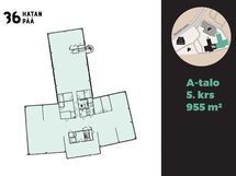 Vuokrattavana suuri toimistotila viidennessä kerroksessa. Tilan kokonaispinta-ala on 955 m², ja se on mahdollista jakaa esimerkiksi seuraaviin osiin: 433 m², 306 m² ja 245 m² kokoisiksi erillisiksi toimistoiksi. Tilakoosta riippuen tilassa on joko yhteiskäyttöiset tai omat wc-tilat kerroksen muiden käyttäjien kanssa. Tilat ovat modernit ja toimistosta on mahdollista saada toimiva monelle eri yritykselle.