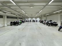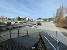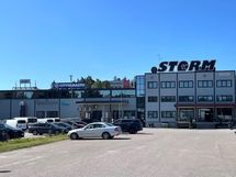 Pysäköintitilaa aidatulla piha-alueella. Sisäänkäynti toimistotiloihin Storm-Motorin myymälän vierestä.