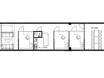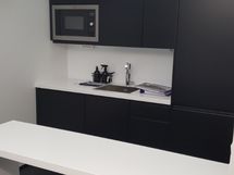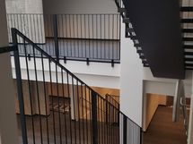 Korkean avotilan lisäksi kolme erillistä työhuonetta, neuvottelutila, laadukas keittiö jossa integroitu jääkaappi ja tiskikone. Lisäksi huoneistolla on parveke sisäpihalle.