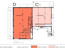Siisti 650 m² varastotila (pohjakuvan D-osa). Tilan suora kulku katutasosta oman nosto-oven kautta tekee arjesta sujuvaa. 650 m²:n tila sisältää logistisesti toimivan lähettämön, lisäksi tilassa on pieni toimisto sekä omat sosiaalitilat. Huonekorkeus on noin 3,5 metriä, ja tila on vuokrattavissa myös yhdessä viereisen 401 m²:n varastotilan kanssa.